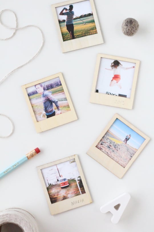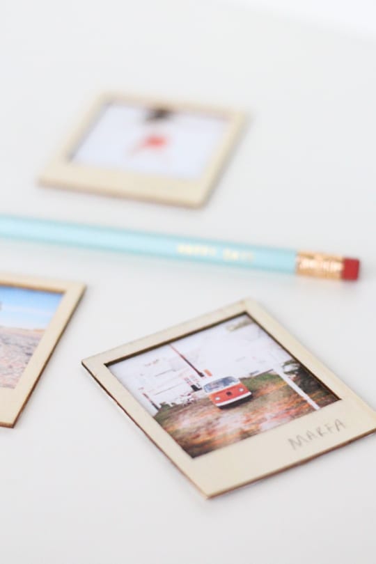 Print out photos at 2 3/4×2 1/4 inches on matte photo paper. Spread tacky glue on one side of a wooden polaroid frame and position over the photo and press firmly on all corners.